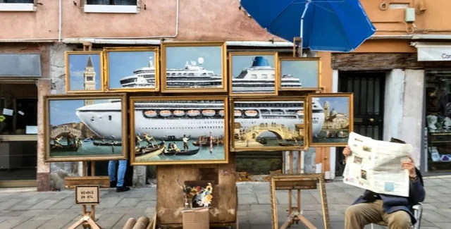 Инсталляция получила название "Venice in Oil" — она представляла собой несколько картин, разных по размеру, составляющих единый сюжет — круизный лайнер в порту Венеции, который загрязняет окружающую среду.