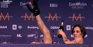Так, во время оглашения результатов, услышав о победе, певец так обрадовался и разошелся, что у него порвались штаны. На видео, опубликованном в официальном аккаунте конкурса в Twitter, видно, как Дамиано скачет по сцене, а затем ложится на ступеньки. В этот момент басистка коллектива по имени Виктория Де Анжелиз указывает Дамиано на дырку, однако тот в ответ встает и растягивает ее еще больше.