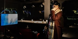 Последнее видео, имевшее повышенный спрос у посетителей, — "Лед" испанца Перу Медема. Надев виртуальные очки, ты попадаешь в портал, двигаешься среди величественных ледяных пирамид и оказываешься на площадке среди гор. Став в некий открытый лифт, начинаешь спуск с большой высоты, здесь реально захватывает дух. Потом оказываешься внутри храма, у которого нет крыши, и наблюдаешь движущуюся мистерию космоса с тысячами разноцветных звездных систем. Впечатляет!