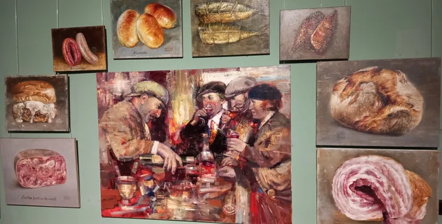 На одной из стен галереи получился такой "уголок гурмана": в центре – аппетитно выпивающие и закусывающие румяные граждане, а их веселую кампанию обрамляет кулинарное великолепие: пирожки, сосиски, подчеревка. "Душистый" особенно хорош!