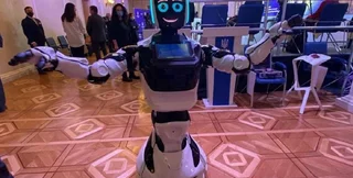 Робот-спикер по имени Эндрю реагирует на голосовые и визуальные команды, а также умеет жать руку, отвечает на вопрос, кому принадлежит Крым, и делает геополитические или экономические прогнозы.