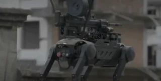 Робот-собака с пулеметом прилетела на дроне и спрыгнула на крышу здания (фото)