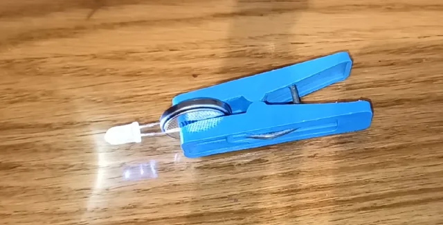 Вам нужно взять одну батарейку-таблетку и на нее "посадить" светодиод так, чтобы его длинная ножка касалась "плюса" — все, фонарик готов. Для надежности зафиксируйте светодиод прищепкой.