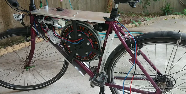 Двигатель стиральной машинки рассчитан на 1100 вольт, но энтузиаст для безопасности ограничил его мощность 48 вольтами и поместил его в центр рамы своего старого велосипеда. Передачу привода парень подключил к одному из передних цепных колец. Кроме того, он модифицировал кривошип, чтобы двигатель мог работать без вращения педалей.