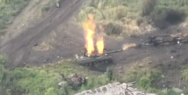 В мае ВСУ показали, как ударный дрон уничтожил танк Т-80БВМ под Угледаром. Оператор метко забросил гранату в открытый люк, что привело к возгоранию и взрыву.