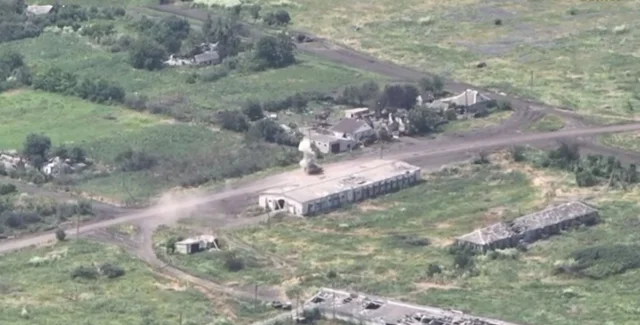 Сначала дрон "наблюдал" за тем, как по дороге мимо помещений, напоминающие складские, ехала БМД-2 с россиянами. Оператор беспилотника дождался оптимального момента и сбросил на движущуюся бронетехнику боеприпас. Удар пришелся по кормовой части машины, в которой расположено моторно-трансмиссионное отделение.