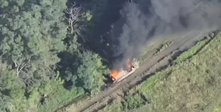 На кадрах видно, что бойцы ВСУ выследили с помощью дрона-разведчика БМП российских оккупантов. Боевая машина ехала по грунтовой дороге, прижимаясь справа к посадке. Местность, по которой двигалась техника, в некоторых местах была перекопана. Также на дороге россиян встретился сгоревший танк без башни.