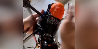 На первой фотографии видно, как мужчина держит в руках FPV-дрон. К квадрокоптеру черной липкой лентой примотана секс-игрушка с головой российского президента Владимира Путина. На втором фото показано уже несколько таких "снарядов" оранжевого и фиолетового цветов.