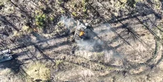 Первый танк, который стоял на грунтовой дороге и уже дымился, украинские воины "добили" с помощью дрона с системой сброса. Оператор направил его к цели, беспилотник завис над бронетехникой и поразил ее в районе башни огнеприпасом. В этот момент из танка повалил густой дым.