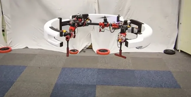 Кольцеобразный корпус устройства выполнен из трех изогнутых соединенных сегментов — дуг. Каждый из них оснащен собственным модулем, состоящим из двигателя и винта. Модули установлены на стержнях, охватывающих ширину каждой дуги. Когда дрон летит, его корпус направлен параллельно земле, а все три винта направлены вверх. Когда он катится, двигатели вращаются вокруг стержней, позволяя ему катиться.
