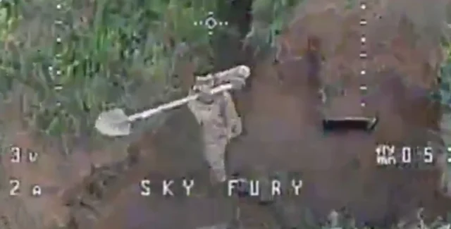 Беспилотник со взрывчаткой, запущенный защитниками Украины, настиг российского солдата в момент, когда тот рыл окоп. Увидев дрон, оккупант начал отбиваться от него лопатой.