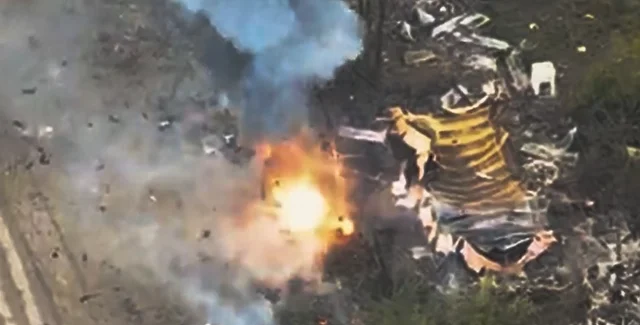 За точным ударом украинского беспилотного аппарата по российской бронемашине последовала детонация боеприпасов.