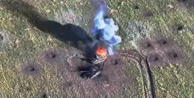 На видео показано, как по российскому танку наносится удар, после чего тот загорается. При этом рядом можно заметить еще один, уже сгоревший, танк.