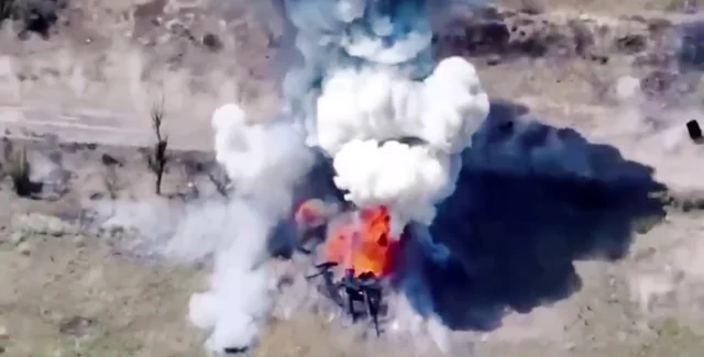 Украинские военные сожгли танк российских оккупантов, сбросив на него взрывчатку с беспилотника.
