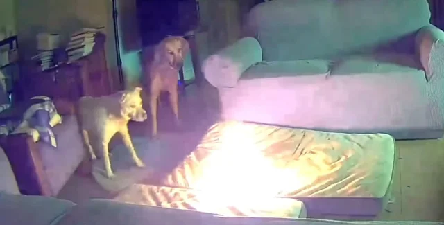 На видео видно, как собака начинает жевать литий-ионный аккумулятор, лежа на матраце в гостиной. В процессе батарея заискрилась, после чего вспыхнул взрыв и загорелся матрац. В это время в комнате находился еще один пес и кот.