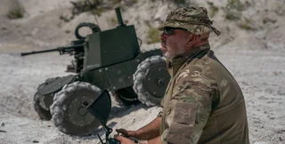 Украинский военный управляет роботом "Лють 2.0"
