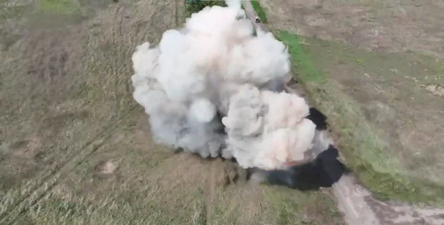 После этого ВСУ показали момент удара по тележке с БК, которую робот, вероятно, вез российским военным. По прицепу также ударил дрон-камикадзе, спровоцировав мощный взрыв. Над местом удара поднялся густой столб дыма.