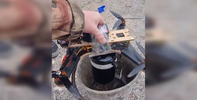 Устройство представляет собой емкость с зажигательной смесью весом 1,5 кг, системой воспламенения и двумя небольшими металлическими швеллерами. С помощью последних оно приматывается к FPV-дрону скотчем.