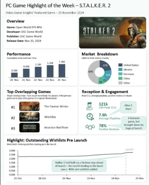 Игра S.T.A.L.K.E.R. 2: Heart of Chornobyl, которую разработала украинская студии GSC Game World, через неделю после релиза, уже разошлась тиражом в более 1,5 млн проданных копий. Об этом свидетельствует статистика Video Game Insight.