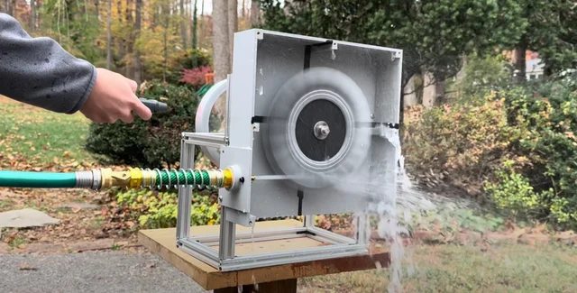 Последний шаг — установка генератора, роль которого выполняет небольшой 62-ваттный мотор. Его Пол Дженкин установил в пластиковом корпусе, который прикрепил к каркасу с помощью T-образных гаек. Турбину и генератор соединили шестеренка на оси и ремень. Чтобы максимизировать передачу энергии от потока воды к лопастям турбины, шланг подключен к сходящемуся соплу.