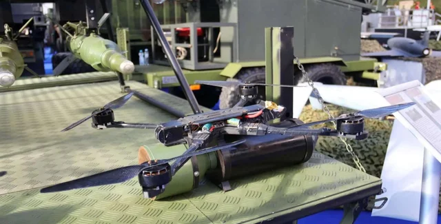 На выставке Partner 2025 в Сербии представили компактный оптоволоконный FPV-дрон Komarac 3 с четырьмя электродвигателями, оснащенный перепрофилированным ПТРК "Малютка".
