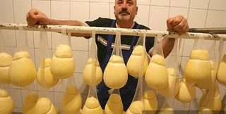 | Неспелые фрукты. Чтобы получился качоковалло, сырному тесту придают форму груши и перевязывают его бечёвкой. В таком виде сыр удобно подвешивать для созревания | |