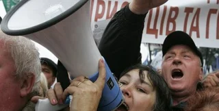 Митингующие стоят с плакатами "Ты с базара ешь и пьешь, нас задушишь - сам помрешь!", "Принятие Налогового кодекса - преступление против беззащитного народа Украины", "Не ту страну назвали Гондурасом!" и т.д.