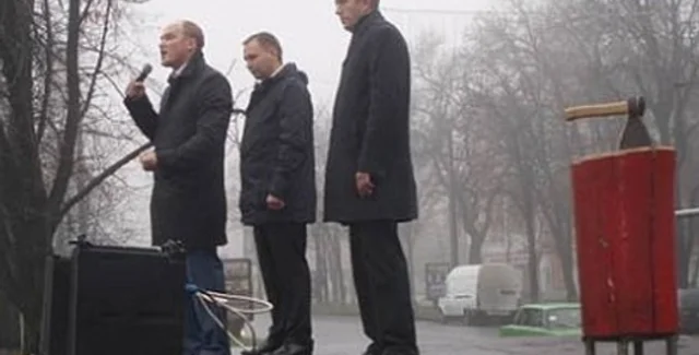 По словам председателя "Союза вкладчиков Украины" Сергея Каплина, красная краска на плахе символизирует "кровь, которую пустили Тигипко и Азаров упрощенцам", сообщает УНИАН.