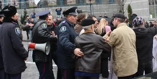 Когда предприниматели перекрыли движение по Крещатику, со стороны Дома профсоюзов выбежали милиционеры.