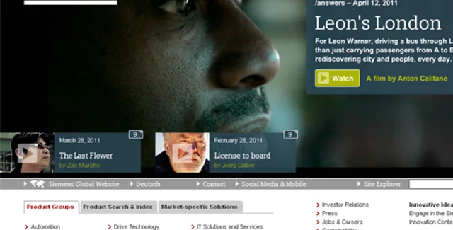 Лидер рейтинга, компания Siemens, обновила концепцию своего сайта в 1997 году, превратив страничку в серию мультимедийных мини-сайтов. Причем в Интернете компания предпочитает рассказывать, а не призывать к покупке чего-либо. На главной странице каждую неделю выкладывается новый короткометражный фильм, при этом Siemens сознательно избегает явной рекламы, завоевывая таким образом лояльность поколения YouTube.