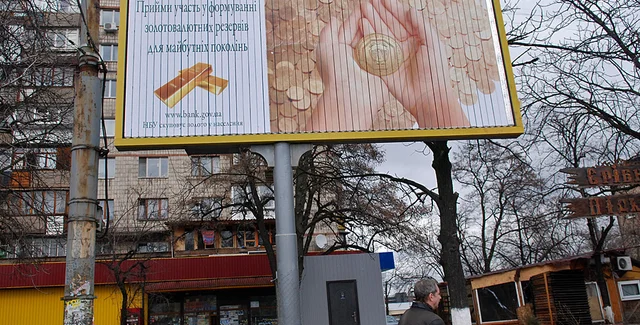 В Киеве появились билборды с рекламой, на которых сообщается о том, что Национальный банк Украины начал скупать золото у населения