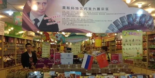 Российские журналисты, прибывшие в город в ходе официального визита в КНР председателя Госдумы Сергея Нарышкина, выяснили, что хозяева лавочки, довольные своим креативным решением, написали на плакате с Путиным призыв покупать российский шоколад.