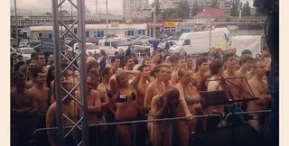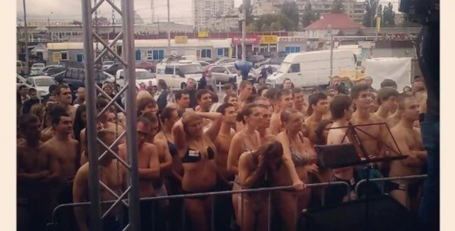 Жители Киева прибыли под один из столичных торговых центров практически обнаженными, следуя заверениям промо-кампании, заверявшей, что посетителям, которые придут на открытие супермаркета в плавках и купальниках, достанется бесплатная одежда и обувь.