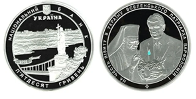 Юбилейная серебряная монета "В честь визита в Украину Вселенского Патриарха Варфоломея I" номиналом 50 грн. запущена в обращение 20 октября. На реверсе монеты изображен Президент Украины Виктор Ющенко. Он держит венок с зажженной свечой, пламя которой имитирует голограмма. Рядом с Президентом запечатлен Вселенский Патриарх Варфоломей I. На аверсе монеты на фоне Днепра и Левобережья изображен памятник Владимиру Великому, открытый в Киеве в 1853 году.