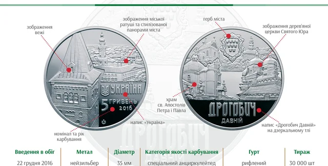 Национальный банк Украины ввел в обращение памятную монету "Древний Дрогобыч", посвященную древнему галицкому городу. Об этом говорится в сообщении пресс-службы Нацбанка в Facebook.