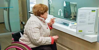 Экскурсия начинается с подъема по пандусу. Чтобы им было удобно пользоваться, угол наклона не превышает 10°, а ширина — не менее метра. Для людей на колясках поручни установлены на высоте 70 см, для остальных — на уровне 90 см. От дверей отделения тактильные маркеры ведут к кассе и к адаптированному банкомату. Он оборудован стандартным разъемом для наушников, маркированной клавиатурой и голосовой навигацией. Для чистоты эксперимента корреспондент Фокуса попробовала пообщаться с таким банкоматом с закрытыми глазами. Доведенные до автоматизма привычные операции поначалу кажутся трудновыполнимыми. Но после того как сотрудница банка вкратце объяснила, как пользоваться банкоматом, при помощи голосовых подсказок оказалось не так уж и трудно вслепую ввести пин-код, узнать остаток средств на счету и завершить работу.