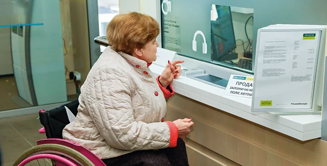 В Виннице есть необычная остановка. Выйдя на ней, ощущаешь под ногами плитку с рельефными линиями и точками. Подобная дорожка — не прихоть дизайнера. Тактильные маркеры на ней обозначают безопасный маршрут для людей с нарушениями зрения, которые для ориентации в пространстве пользуются белой тростью. Эта дорожка ведет к дверям инклюзивного отделения Ощадбанка. Для клиентов, которые пользуются колясками или которым трудно подниматься по ступенькам, здесь оборудован пологий пандус. Перед заездом на него расположена кнопка вызова менеджера. Через несколько секунд после нажатия на нее из дверей отделения выходит приветливая девушка — сотрудник банка. Однако вместо клиента на коляске она видит корреспондента Фокуса, желающего на личном опыте проверить, как инклюзивные банковские отделения работают в Виннице.