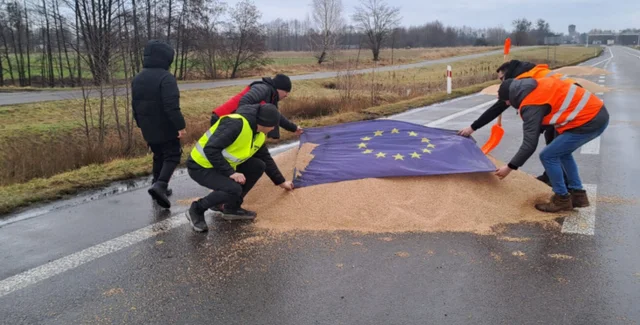 Февраль 2024 года. Польские фермеры высыпали зерно из украинских грузовиков в пункте Ягодин-Дорогуск. | Фото: Агрополит