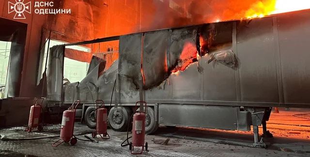В результате падения обломков дрона загорелся прицеп с посылками | Фото: ГСЧС