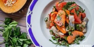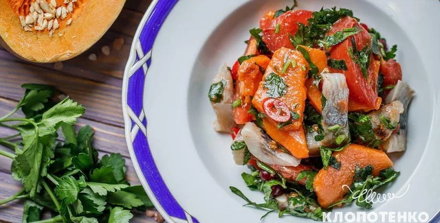 Рецепт необычного салата с тыквой, сельдью и томатами от Клопотенко