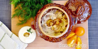 - На дно глиняного горшка выкладываем один-два драника, сверху кладем столовую ложку жареных грибов и приправляем соусом. Чередуем так слои, наполняя горшок. Запекаем в духовке 20 минут при температуре 180°C.