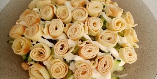 Яичные блинчики смазать майонезом, скрутить трубочкой. Нарезать готовые блинные рулеты шириной 1,5-2 сантиметра и выложить поверх салата. По краям украсить зеленым луком.