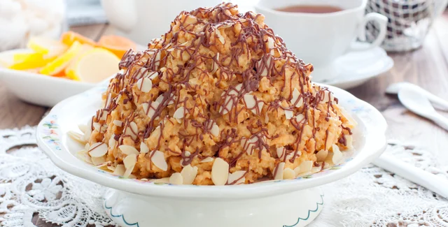 - Выложите всю массу или на тарелку в форме горки (так будет практичнее), или в форму (так будет красивее). Сверху присыпьте натертым шоколадом.