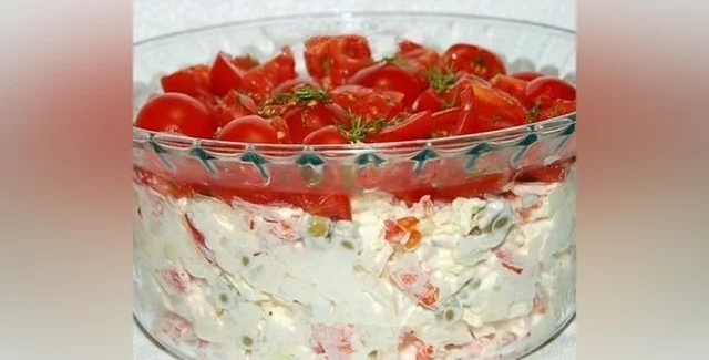Ингредиенты для салата могут быть любыми, а вот верхушка – обязательно из томатов.