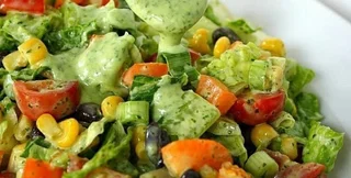 Сначала необходимо приготовить соус. Для этого в кухонном комбайне нужно смешать кинзу, авокадо, йогурт, сок лайма, чеснок, оливковое масло, винный уксус и соль до получения однородной массы. Отрегулировать вкус.