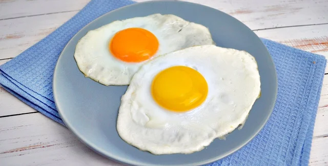 Яйца нужно жарить на теплой сковороде с маслом, а жарить на слабом огне под крышкой.