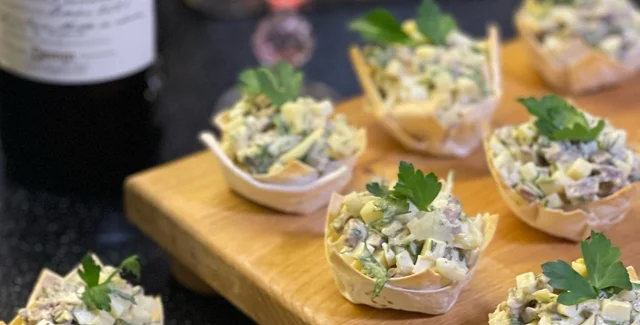Салат с куриными сердечками в корзинках из лаваша: простой и доступный рецепт