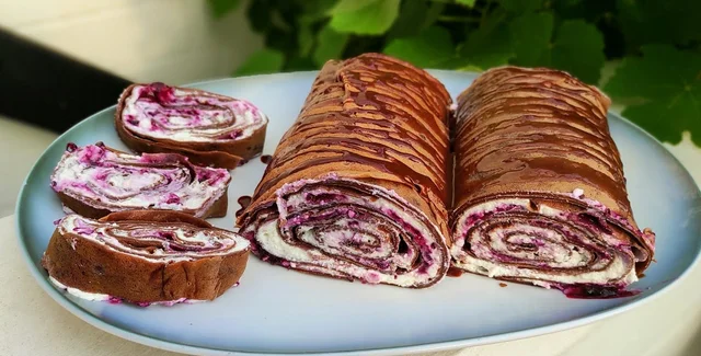 - Дальше делаем как на видео. Смазываем блин кремом и немного отступая от края первого блинчика, кладем новый и снова крем, повторяем так пока не закончатся блинчики и крем. Выкладываем вишню. Скручиваем все в рулет и заворачиваем в пищевую пленку. Убираем в холодильник на несколько часов.
