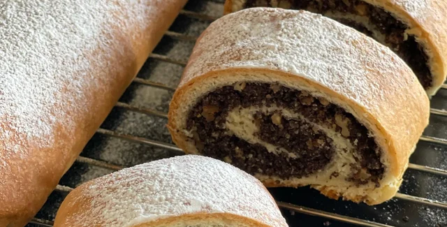 Маковый рулет с орехами, испеченный на дрожжах и посыпанный сахарной пудрой, – что лучше может быть к чаю или к кофе. Готовится он просто, а из ингредиентов, перечисленных автором кулинарного блока "Вкусные рецепты на каждый день" получается два рулета длиной 28 сантиметров, чего хватит, чтобы угостить как можно больше родных и близких.