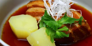 Теперь — тушение. Перекладываем грудинку в кастрюлю, заливаем квасом (свекольным или обычным черным, как говорилось) и тушим в течение 10 минут. Лук нарезаем кубиками, свеклу натираем на крупной терке. Добавляем все это к свиниyе и тушим еще 15 минут. Солим и перчим. После этого, по идее, надо бы добавить тертый черствый черный хлеб (4 тонких ломтика) и тушить уже до готовности лука и свеклы.